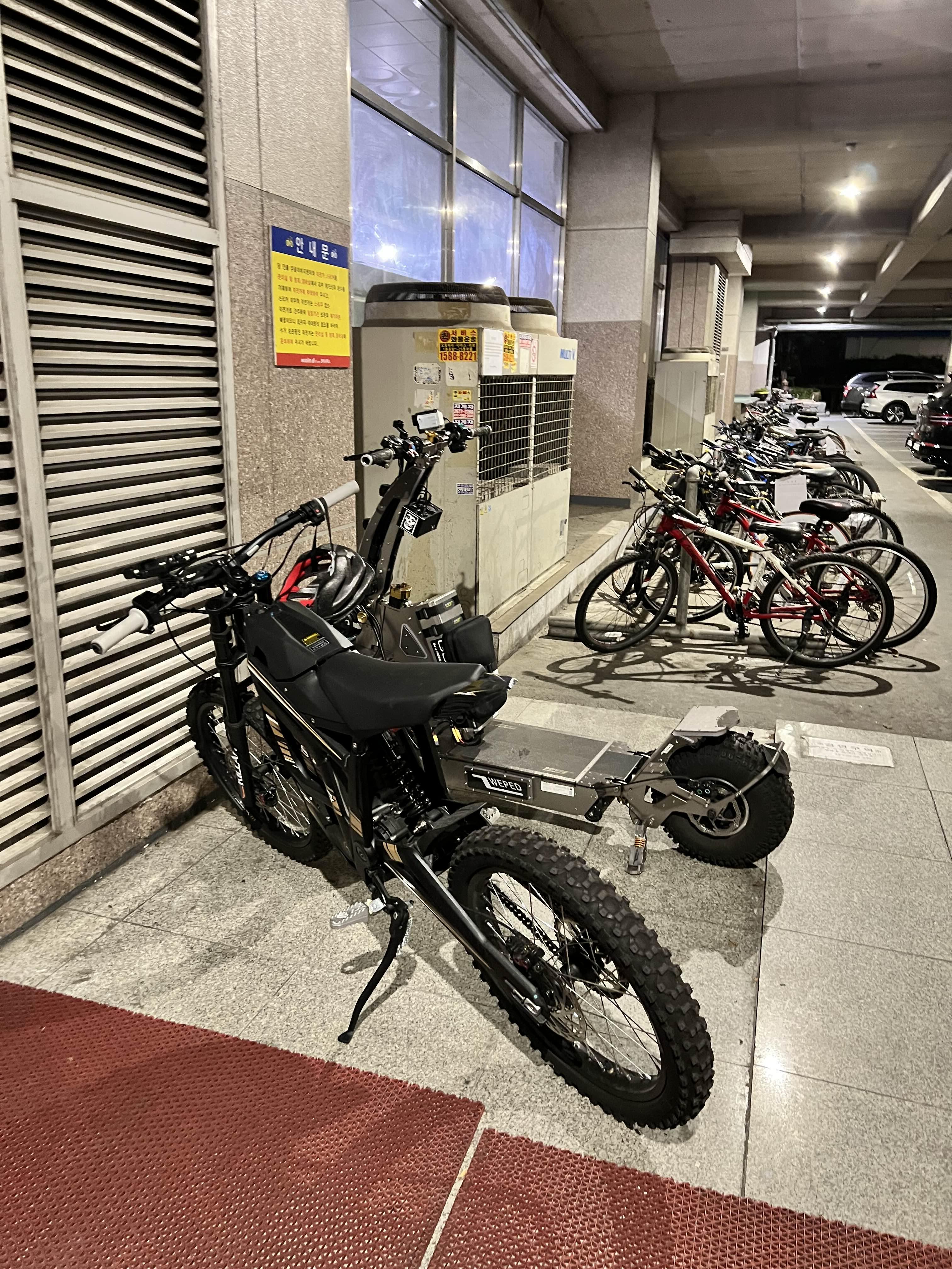2번째 사진은 같은 부서 직원 중 한 명이 타고 다니는 탈라리아라는 고성능배터리 자전거이다. 스펙이...대략 60v 38ah이었나?? 덩치도 내 다크나이트만해서 누가 보면 자전거가 아니라 오토바이인 줄 알 거다 ㅋㅋㅋ 다나와 나란히 세워두니 탈라리아도 비주얼 압박이 엄청나군... 언젠간 나도 킥접하고 나면, 이런 류의 산악바이크로 넘어가지 않을까 싶긴 하다 ㅎㅎ;